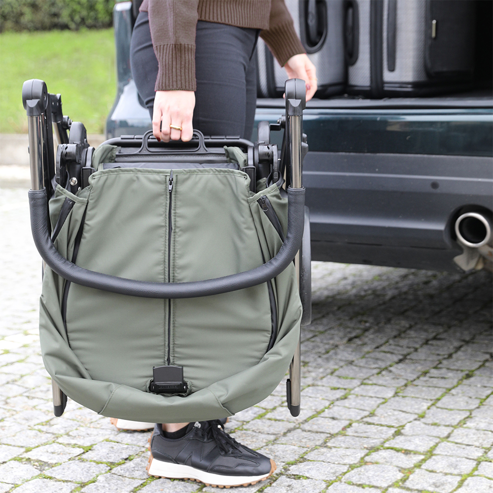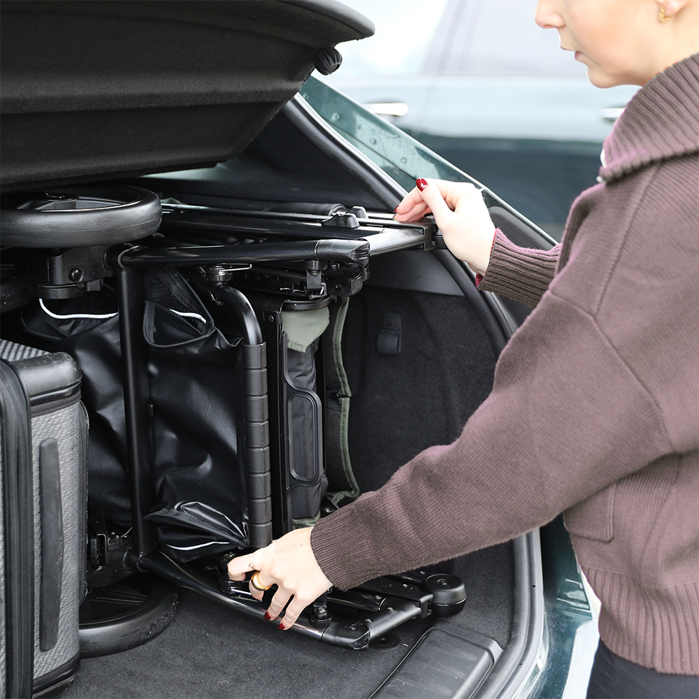 Su plegado ultra-compacto y con solo 50cm de ancho, se adapta fácilmente a cualquier maletero o transporte. Se maneja con una sola mano gracias a sus rodamientos y suspensión en las 4 ruedas, ofreciendo el máximo bien estar.